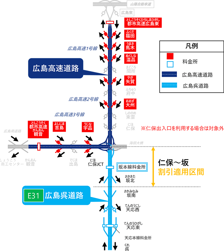 当社が管理するE31 広島呉道路と広島高速道路公社が管理する広島高速道路を連続して利用するETC車に対して、広島呉道路 仁保~坂 間の料金から下表の通行料金を割引します。