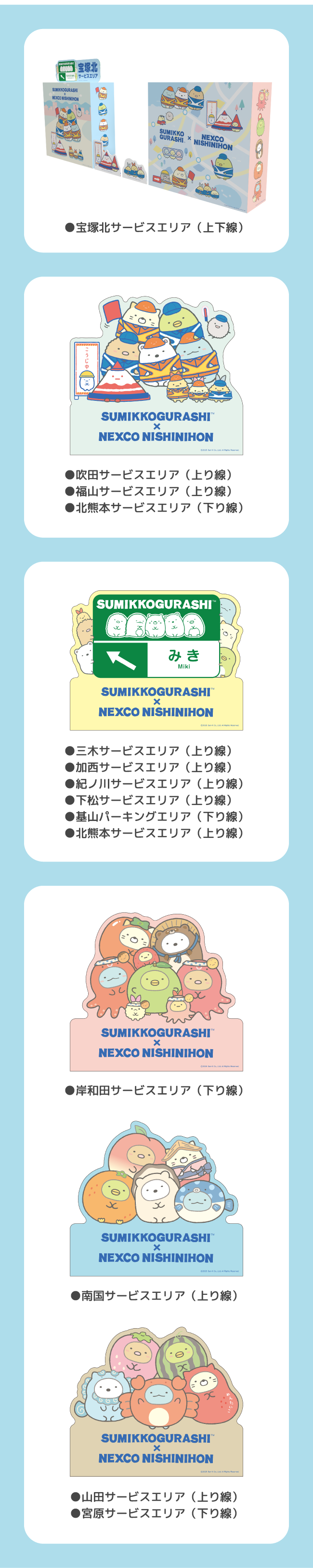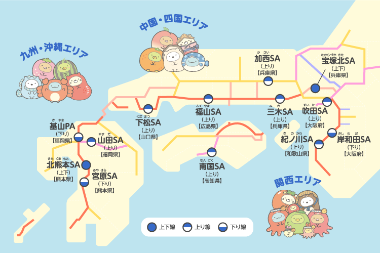 好評につき、今年も「すみっコぐらし」とNEXCO西日本がコラボレーション!期間中、サービスエリア(SA)・パーキングエリア(PA)でのオリジナルグッズの販売やフォトスポットを設置します。カワイイすみっコぐらしのなかまたちに会いに来てください。今年も新グッズがぞくぞく登場。ネット販売も行います。詳細は「オリジナルグッズ」ページをご覧ください。
